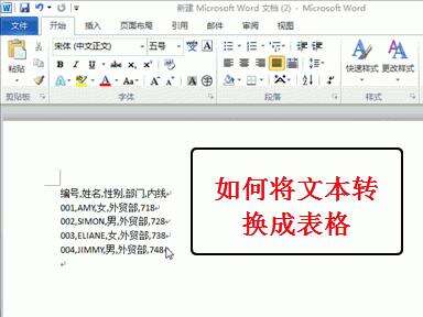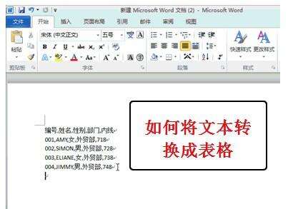3、点击“插入 -> 表格 -> 文本转换成表格”,然后设置列数、行数和文字分隔位置,点击“确定”按钮。