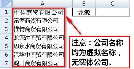 1、查看下原始数据,A列是一些公司全名,在B1处输入一个简称或者说关键字(必须是在A列某个文本中连续包含的关键字),要在C1返回A列对应的全称。