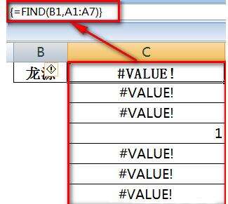 5、来看一下LOOKUP运算过程。首先FIND(B1,A1:A7)表示在A1:A7内查找B1内容,若查找不到则返回错误值,若查到返回在文本中的位置。