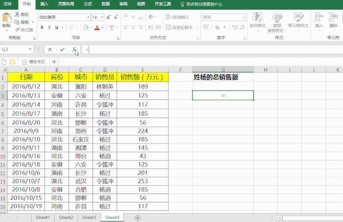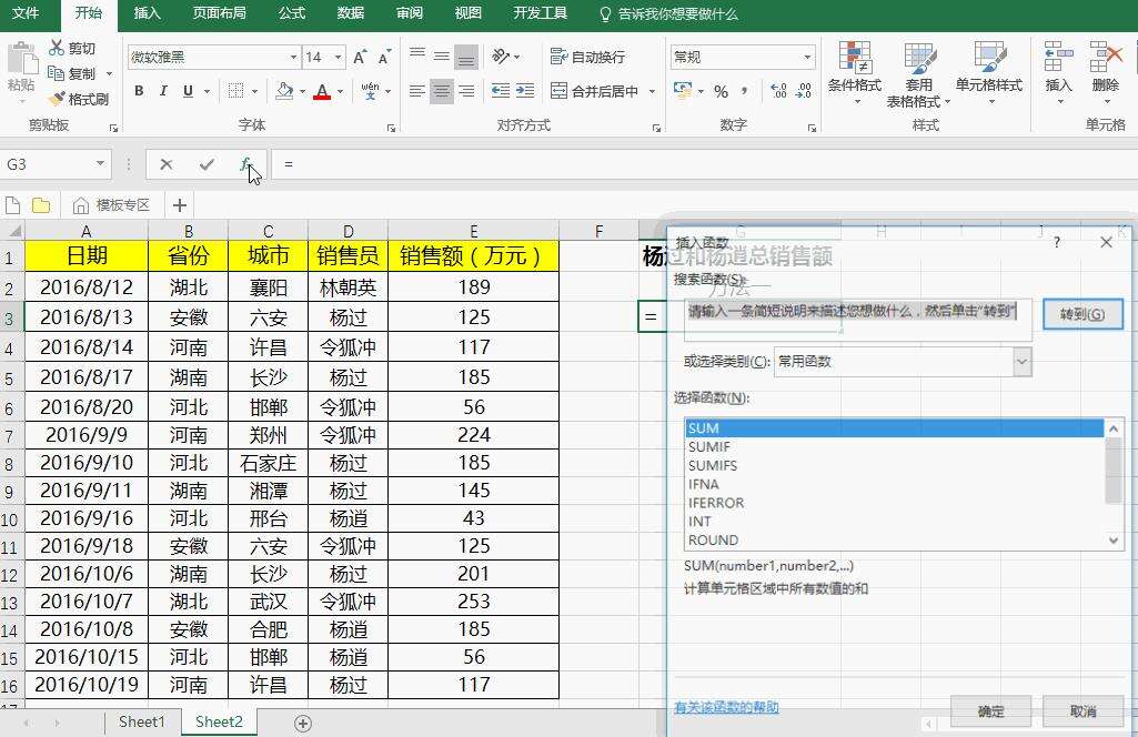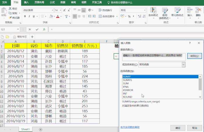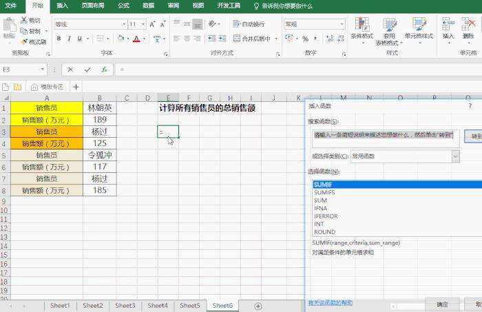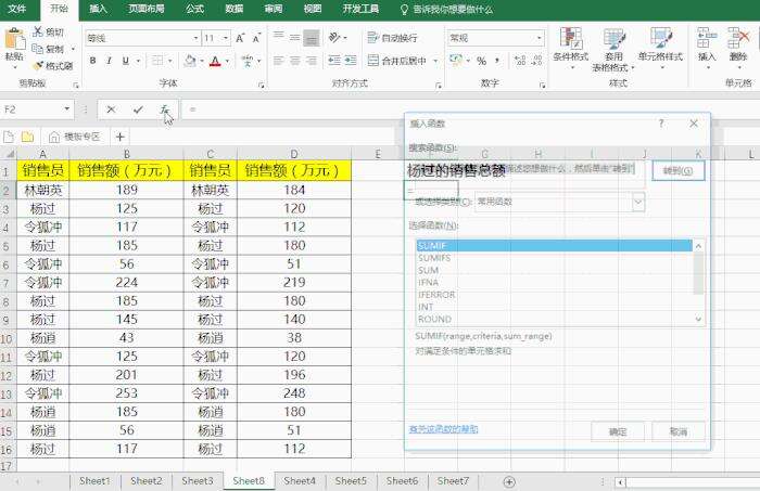 注意:查找条件为销售员“杨过”,条件区域为销售员,求和区域比查找区域往右偏移一列,意思是统计销售员右一列的数据,即各销售员的销售额。