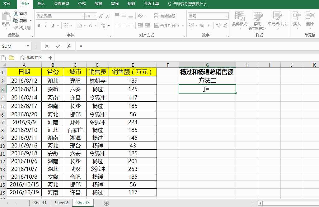 注意:SUMIF(D2:D16,{“杨过”,”杨逍”},E2:E16)是一个数组公式,指代的结果是{杨过销售额,杨逍销售额},再用SUM公式求和,即可得到杨过与杨逍的总销售额。