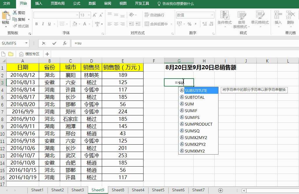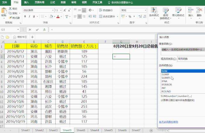 相当于=SUMIF(A2:A16,”>=2016/8/20″,E2:E16)-SUMIF(A2:A16,”>2016/9/20″,E2:E16),即8月20日至9月20日的销售额=8月20日以上的销售额-9月20日以后的销售额。