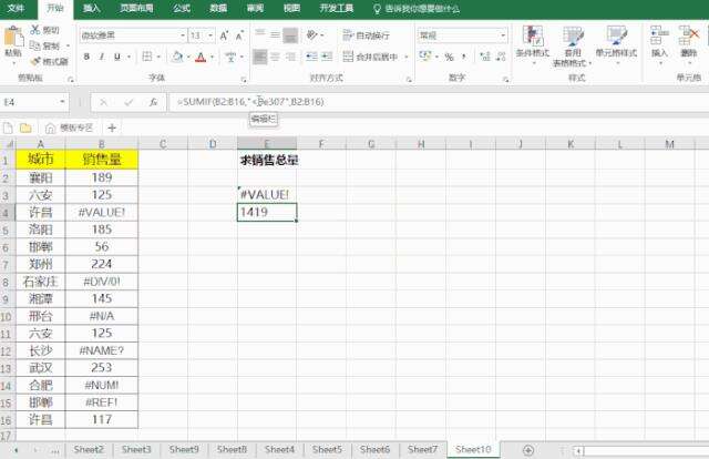 计算全国销售总量。由于销售量中有不同类型的错误值,所以不能用SUM直接求和,可以使用SUMIF函数实现排除错误值求和。