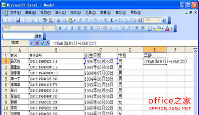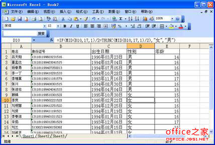 选中“性别”列的单元格,如D2。输入“=IF(MID(B2,17,1)/2=TRUNC(MID(B2,17,1)/2),"女","男")”(注意如上)后回车,该生“是男还是女”已经乖乖地判断出来了。拖动填充柄让其他学生的性别也自动输入。如图2。