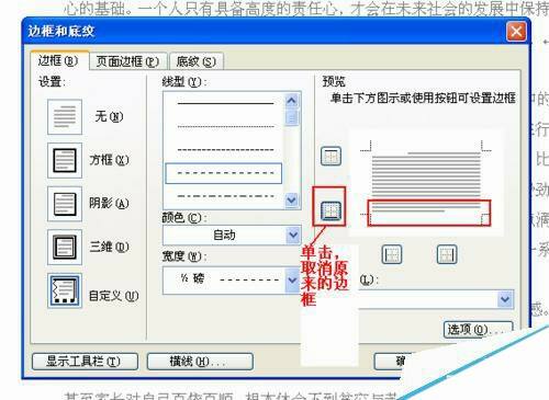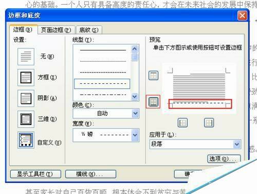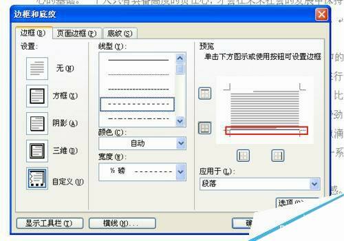 下面这一步是最关键的,选中线型后,如果直接点“确定”,你会发现页眉里的线还是直线,没有变化。问题在“边框和底纹”对话框的右边“预览”,也要操作。