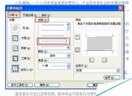 在“边框和底纹”对话框里,选择“边框”选项卡,然后在“线型”栏里,选择你想要的虚线类型,单击选中。