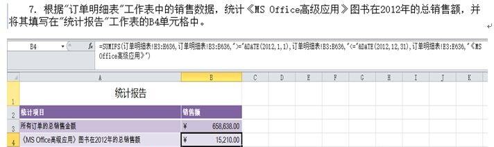 首先第一个参数sum_range我们要输入求和的范围,也就是”订单明细表”工作表中的小计列,范围是H3:H636;接下来输入第二个参数range,也就是条件区域,选择”订单明细表”工作表中的日期列B3:B636,第三个参数criteria输入条件,”>=”&DATE(2012,1,1);接下来输入第四个参数range2,也就是条件区域,选择”订单明细表”工作表中的日期列B3:B636,第五个参数criteria2输入条件,”<=”&DATE(2012,12,31);接下来输入第六个参数range3,也就是条件区域,选择”订单明细表”工作表中的图书名称列E3:E636,第七个参数criteria3输入条件,《MS Office高级应用》。最后点击确定即可。