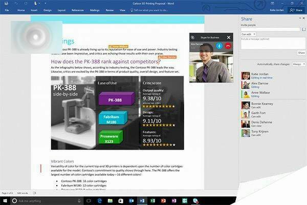 • Skype for Business现已可用,允许用户在文档中与其他用户进行即时消息通信,分享屏幕,或者进行语音和视频聊天。这项功能晚些时候还会被添加到Office Online中。
