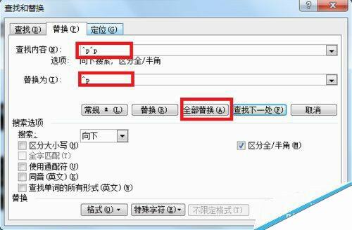 7、在【查找内容】中输入两个^p,在【替换为】中输入1个^p;