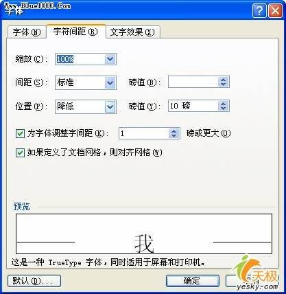 4、切换到“字符间距”标签下,单击“位置”右侧的下拉按钮,在随后出现的下拉列表中,选择“降低”选项,并在后面的“磅值”框中输入一个数字(根据需要调试,如“10磅”),确定返回。