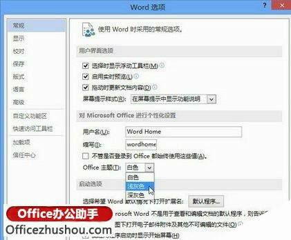 第2步,打开“Word选项”对话框,在“常规”选项卡中单击“Office主题”下拉三角按钮,在主题颜色列表中选择合适的Office主题颜色,并单击“确定”按钮即可,如图2所示。