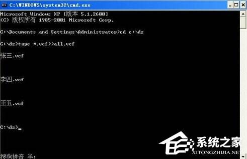 4、然后输入 type *.vcf》》all.vcf 注意有空格。这个命令是合并命令。然后关闭cmd窗口。