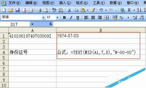 3、TEXT是一个返回文本类型的函数,使用格式:TEXT(value,format_text);一般有两个参数组成,前一个引号文本或文本单元格,后一个表示文本类型,公式中mid(A1,7,8)就是第一个参数,#-00-00就是第二个参数。也就是说将mid(A1,7,8)得到的结果19740703,改变成“#-00-00” 形式的文本,在这里就是1974-07-03。