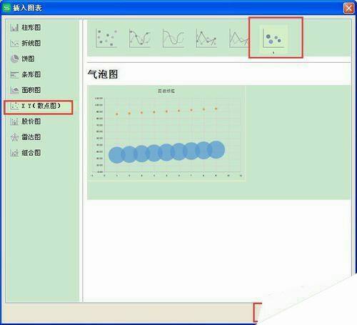 3、弹出图表对话框,在左侧列表中选择“XY(散点图)”,在右侧上方选择最后一个气泡图,点击确定
