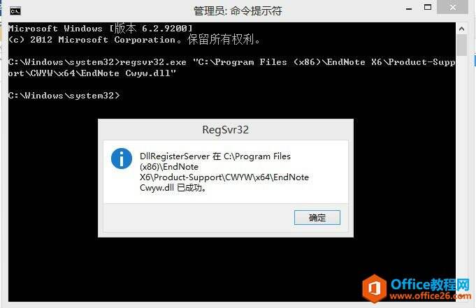 3.复制路径,加上EndNoteCwyw.dll,即为C:ProgramFiles(x86)EndNoteX6Product-SupportCWYWx64EndNoteCwyw.dll,在命令提示行中输入regsvr32.exe"D:ProgramFiles(x86)EndNoteX6Product-SupportCWYWx64EndNoteCwyw.dll",提示成功后就基本成功一半了(复制上述命令,在命令行中右键选择粘贴即可)