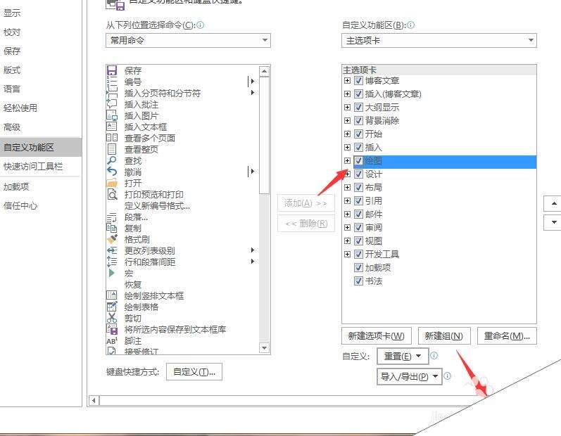 2、之后在右边可以依次的找到绘图,这里默认是没有被勾选上的,我们把绘图勾选上。点击下方的确定保存。