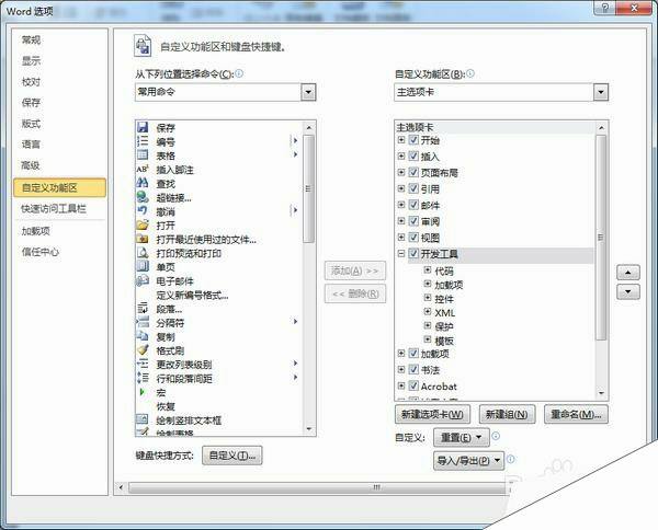 1、首先需要调出控件工具WORD2010下“文件”菜单下:选项-自定义功能区,最右边勾选“开发工具”,这样在顶部右边出现了“开发工具”选项卡。如图: