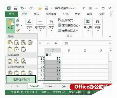 2、选择目标单元格区域,在“开始”选项卡的“剪贴板”组中单击“粘贴”按钮上的下三角按钮,在打开的下拉列表中选择“选择性粘贴”选项,如图2所示。