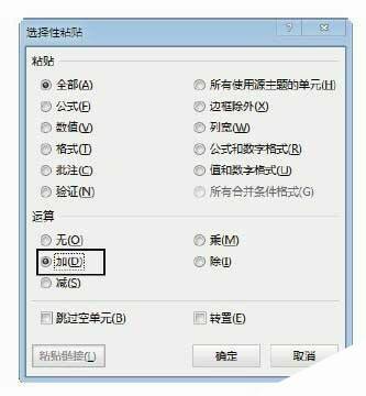 3、打开“选择性粘贴”对话框,在“运算”栏中选择“加”单选按钮,如图3所示。
