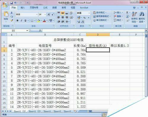 2、现在需要计算的是容性电流值一列和乘以系数一列,如果徒手计算会非常麻烦,而且还可能计算错误,如单纯的计算器,输入并誊写结果效率也不高,现在我们利用EXCEL的插入公式自动计算功能进行计算,在编辑区域输入公式,并输入具体数值