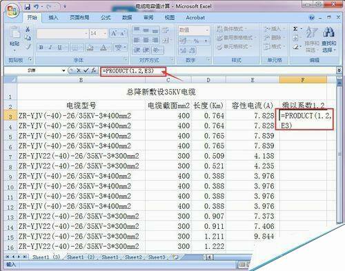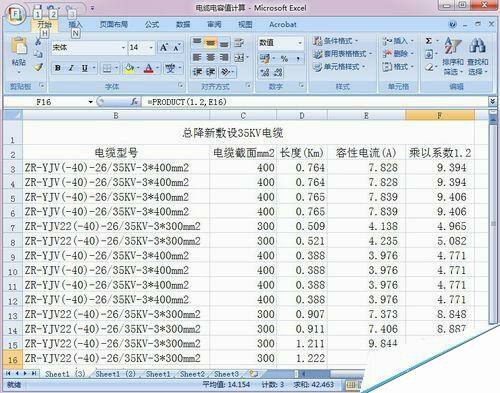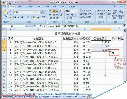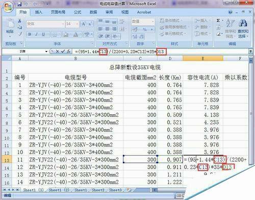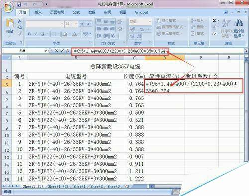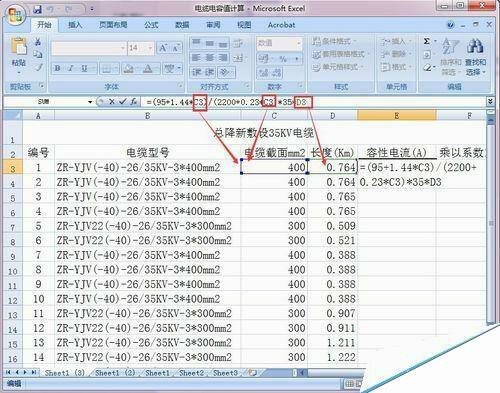 3、然后把结果放在所在的列就可以,回车计算结果自动填入,因为公式中有引用电缆截面的数据,所以我插入一列,单摘出电缆截面面积数据,公式为:[(95+1.44S)/(2200+0.13S)]Un*L其中的S可直接引用单元格数据,L也是直接引用,这样就方便多了