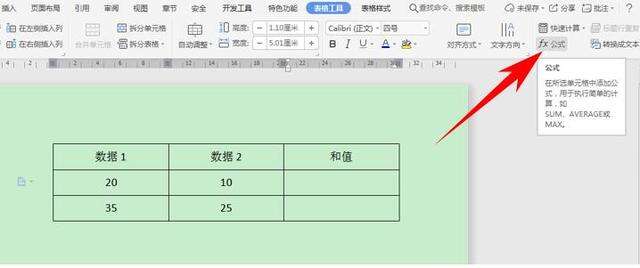 在表格当中插入数据,首先我们先计算两数之和,单击工具栏【表格工具】下的【fx公式】,如下图所示: