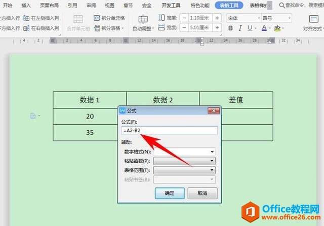 差值也是同样的计算方法,在输入框中输入=A2-B2,单击确定:
