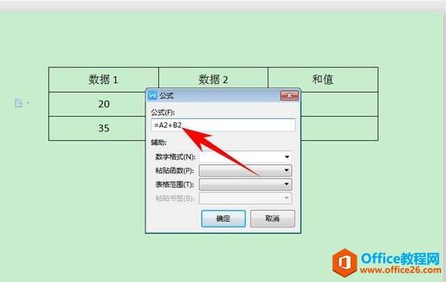 弹出【公式】的对话框,值得注意的是,在Word的表格当中,跟Excel表格有异曲同工之处,数据依旧是按照A1、B1等排列顺序而排列的,所以,在公式的输入框当中,输入公式=A2+B2,单击确定即可: