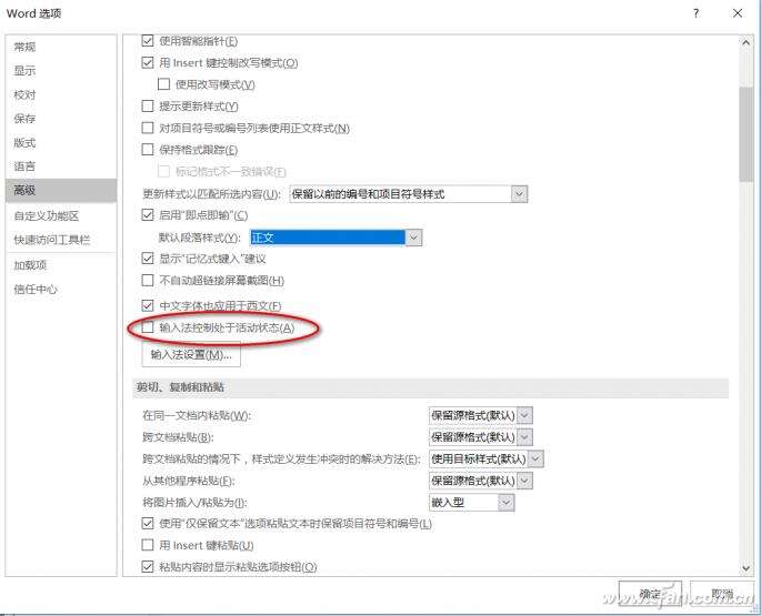 在Word选项窗口中,点击左侧“高级”选项,在右侧窗格中可见“输入法控制处于活动状态”选项处于被选中状态,这时只需将选择框中的对勾取消掉,就可以解决输入法无法切换的问题了。