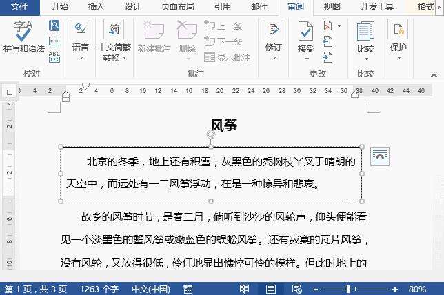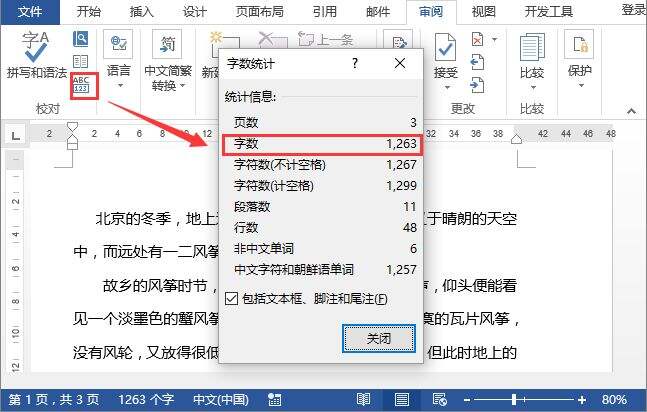 比如:我们在文档中插入一个文本框,将第一段内容剪切到文本框中。这时再打开“字数统计”对话框,取消勾选“包括文本框、脚注和尾注”复选框,就可以排除文本框中的文字。此时,可看到“字数”就从原来的 1263 字变成了 1212 字了。
