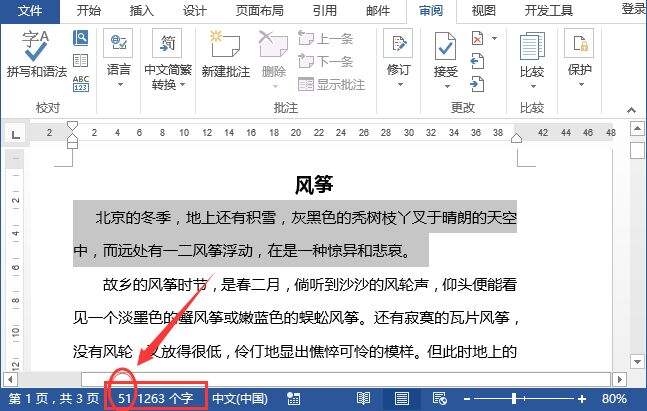 方法很简单:拖动光标选中某行或某段落,状态栏将会自动显示字数。