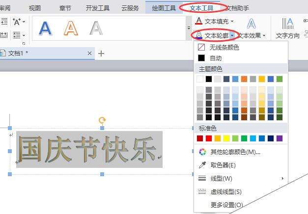 6、然后设计文本轮廓,同样选中插入的艺术字,点击菜单栏中的【文本工具】-【文本轮廓】,在下拉列表中选择轮廓样式、颜色等
