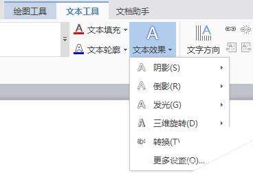 7、下面设计文本效果,同样选中插入的艺术字,点击菜单栏中的【文本工具】-【文本效果】,在下拉列表中选择相应的文本效果,若没有想要的效果可以选择更多效果,进行自定义设计