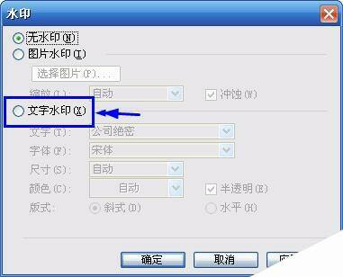 按上面的方法打开到【水印】设置窗口,选着【文字水印】。