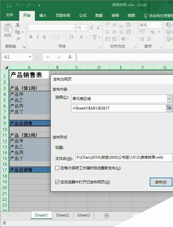 点击“发布”后,如果工作簿中有多个表格,在打开的发布窗口中可以进行选择,也可以指定表格的单元格区域。此处还可以看出这一方法的更大优势,就是它能一次性将整个工作簿的所有表格全部导出。