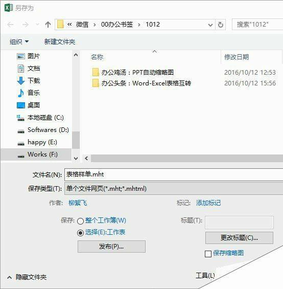 在打开的另存对话框中,选择保存类型为“单个文件网页(*.mht;*.mhtml)”,并在下面点选“选择(E):工作表”。