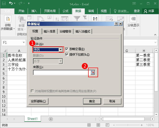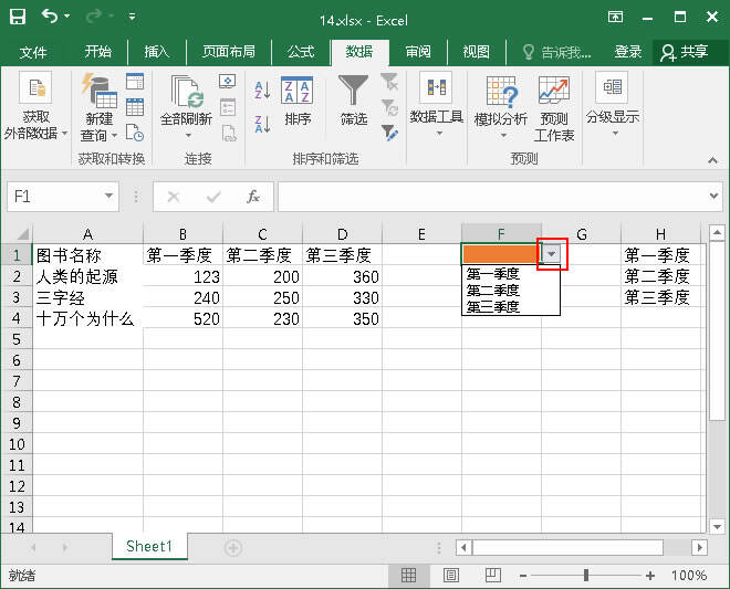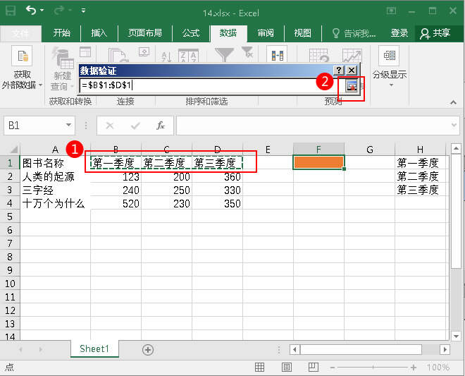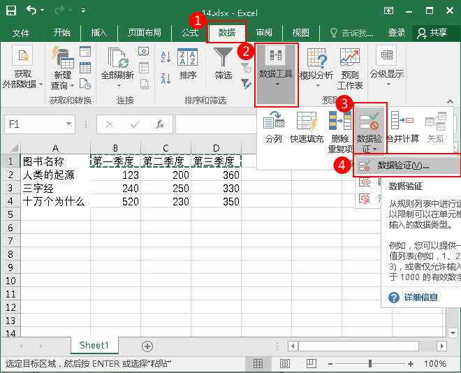 4.单击F1,然后切换到数据选项卡上的数据工具选项组,并单击数据验证中的数据验证。