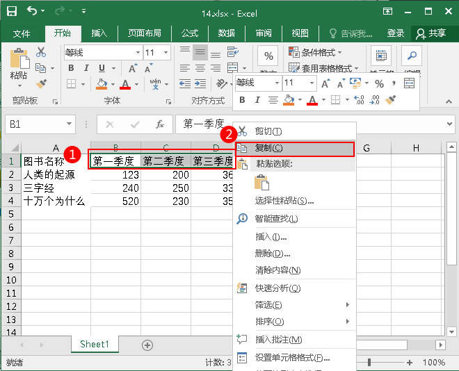 2.选择B1: D1区域,点击鼠标右键,在弹出的快捷菜单中点击“复制”。