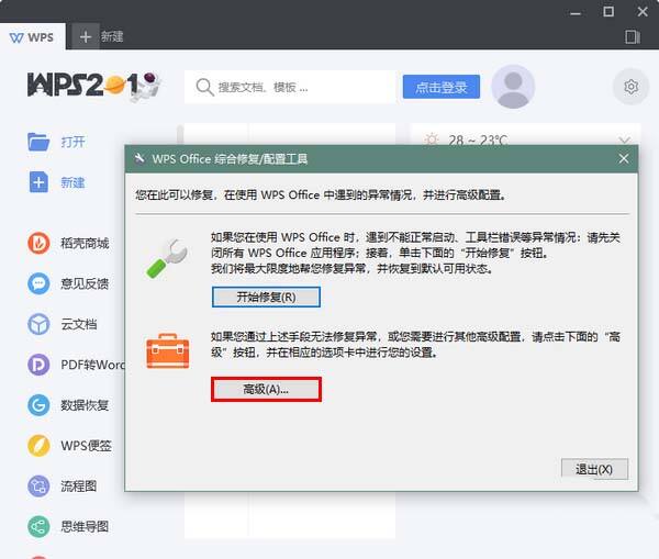 4、点击之后,将会弹出“WPS Office 综合修复/配置工具”窗口。在这个窗口中,点击“高级”。