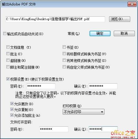 勾选“权限设置”,调整PDF文档的阅读权限。