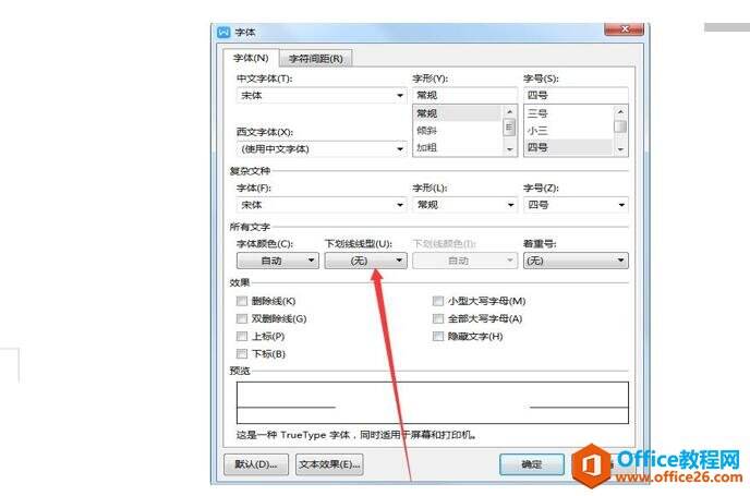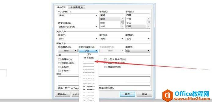 步骤五:点击【字体】,然后找到【下划线线型】: