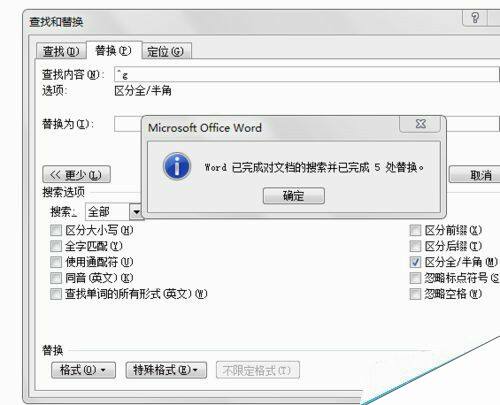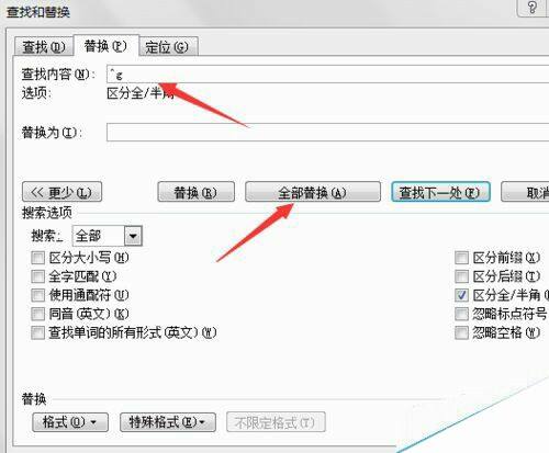 5、这个时候,会在查找和替换的输入框中,出现查找内容那一栏,中出现^g这一项 ,然后点击全部替换,就能完成整个文档的图片删除,点击一个个替换,就慢慢地删除图片