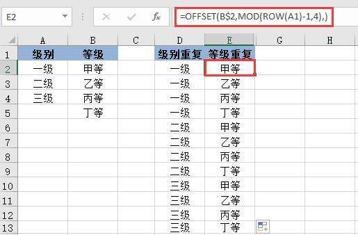 ROW(A1)随着公式向下填充,返回值自动变为1、2、3、4、5……,MOD为求余函数,MOD(ROW(A1)-1,4)返回值为0,1,2,3,0……,OFFSET(B$2,MOD(ROW(A1)-1,4),)即以B$2为基准点,向下偏移0行,1行,2行,3行,0行……,即返回甲等、乙等、丙等、丁等、甲等……。