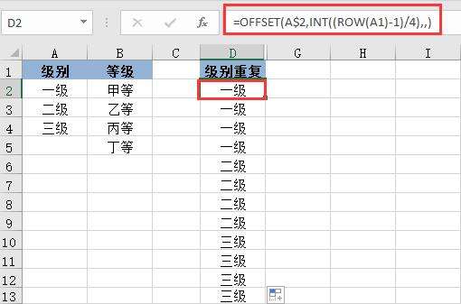 因为“级别”要重复四次,所以用INT((ROW(A1)-1)/4)。