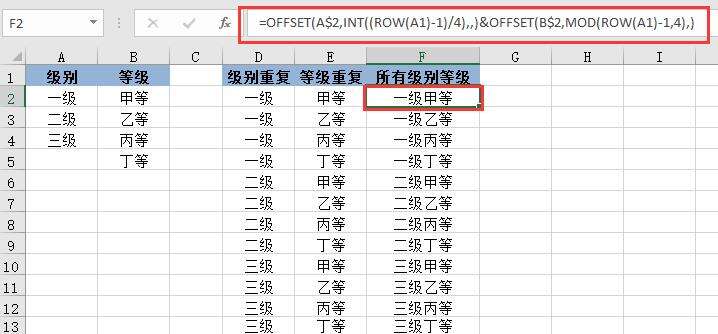ROW(A1)随着公式向下填充,返回值自动变为1、2、3、4、5……,(ROW(A1)-1)/4返回0、1/4、2/4、3/4、4/4……,再用INT取整,返回值为0、0、0、0、1……,OFFSET(A$2,INT((ROW(A1)-1)/4),,)即以A$2为基准点,向下偏移0行、0行、0行、0行、1行……,即返回一级、一级、一级、一级、二级……。