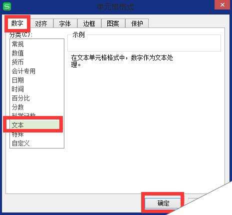 5、完成第三或者第四步骤之后,会出现以下界面;然后点击最上方菜单中的“数字”按钮,再选择“文本”格式,最后点击“确定”按钮;
