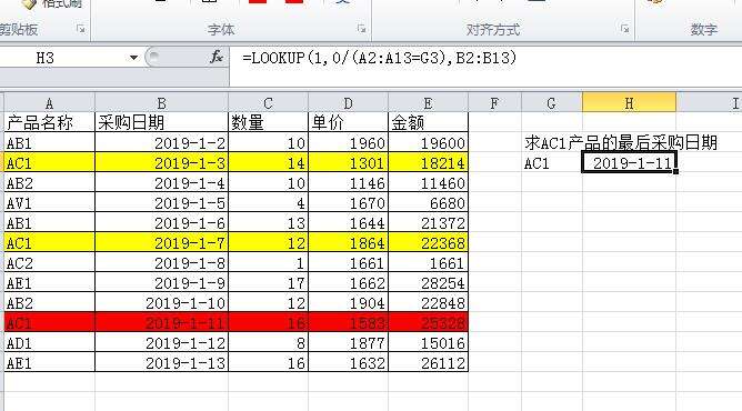 我们在G3单元格中输入产品的名称AC1,然后在H3输入公式是=LOOKUP(1,0/(A2:A13=G3),B2:B13)
