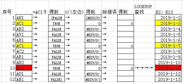 4、然后我们上面公式的第一个参数是1,也就是我们用1去{“”;0;“”;“”;“”;0;“”;“”;“”;0;“”;“”}这部分区域去找等于或者最接近且小于的位置,按照lookup函数的二分法,会首先去找到等于1的,显然没有,然后就找最接近且小于的1的位置,因为上面的0,都是满足小于且最接近,又因为Lookup函数默认你是按升序排列的,所以会死脑筋的一直往下找到最后一个0的位置,此时我们算一下是第10个位置满足,于是lookup函数就返回B2:B13这里的第10个位置,也就是B11(建议你手指的数一数),所以最后结果就是得到B11单元格的值也就是2019-1-11