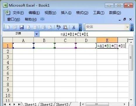①在E1单元格中输入乘法公式“=A1*B1*C1*D1”。