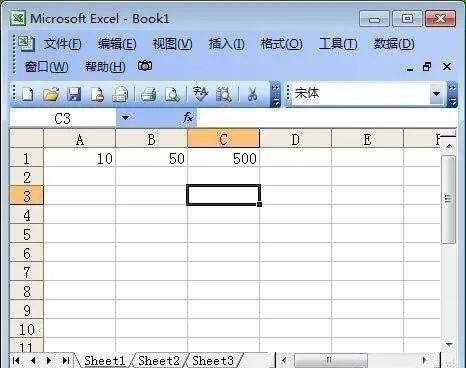 ③现在我们在“A1”和“B1”单元格中输入需要相乘的数据来进行求积,如下图,我分别在A1和B1单元格中输入10和50进行相乘,结果在C1中就会显示出来,等于“500”。